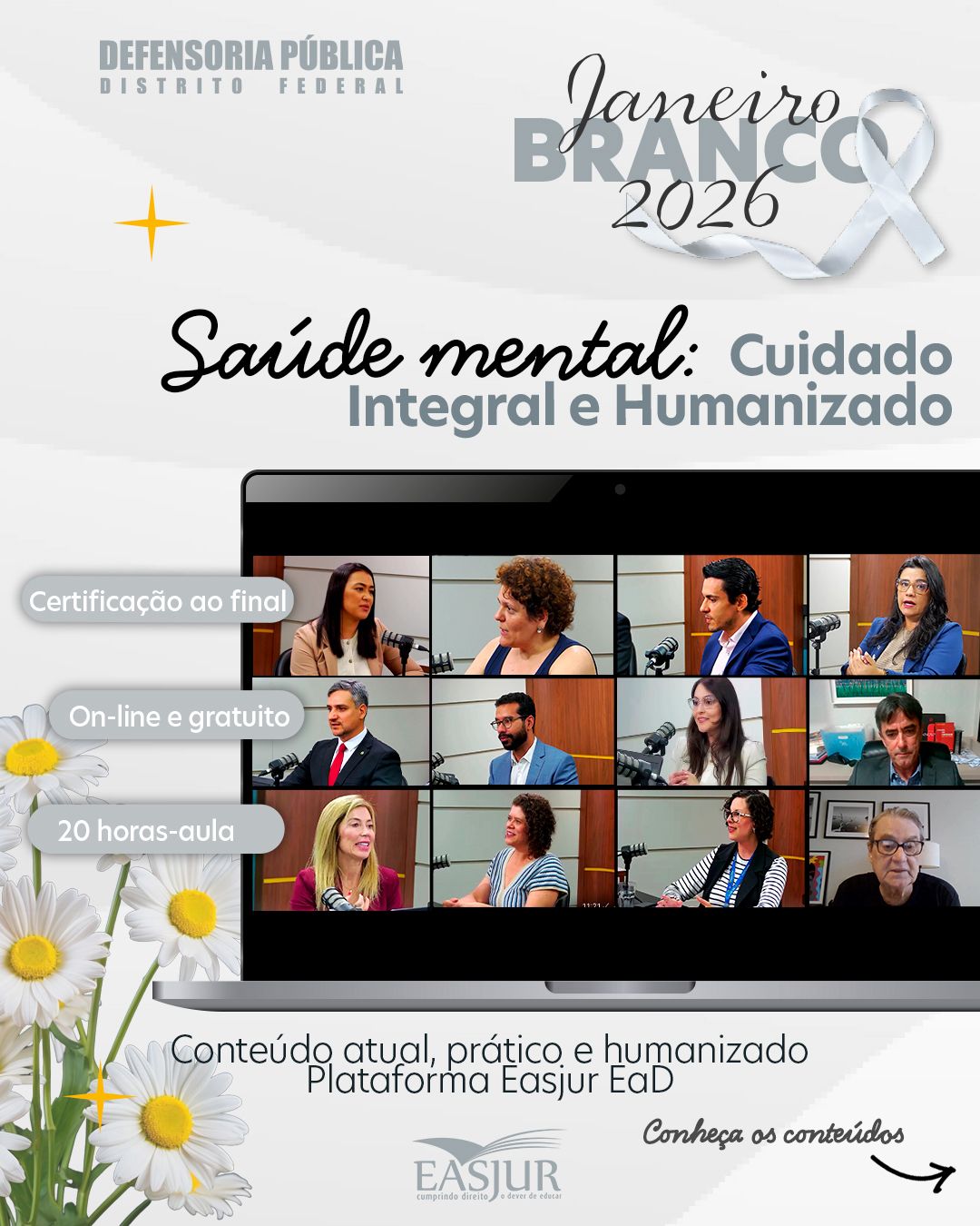 A Defensoria Pública do Distrito Federal disponibilizou o curso Saúde Mental: Cuidado Integral e Humanizado – Direitos e Proteção, uma formação on-line, totalmente gratuita e com certificação na Easjur EaD.